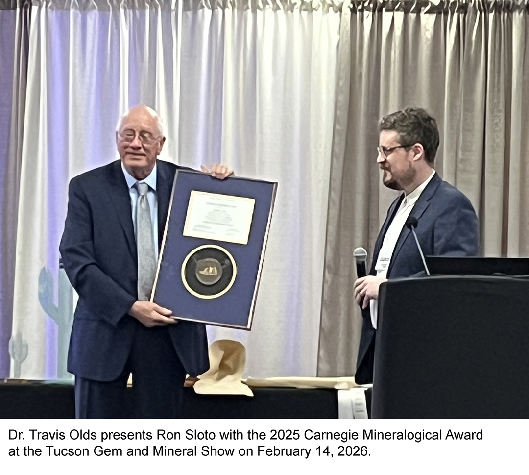 Olds presented the award to Sloto on February 14, 2026, at the Tucson Gem and Mineral Show.
